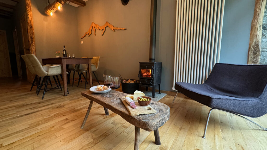 De sfeervolle houtkachel is perfect voor de frissere dagen, waarbij u zich kunt opwarmen en gezellige momenten kunt beleven, terwijl u geniet van het prachtige landschap.